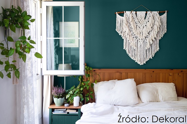 Szlachetny ton we wnętrzu w wiejskim klimacie można zbudować poprzez akcentową ścianą w bardziej zdecydowanym nietuzinkowym odcieniu. Wysublimowany, ale bliski naturze kontrast w białej sypialni zapewni ozdobne tło za wezgłowiem łózka w odcieniu Ciemny szmaragdowy z kolekcji Dekoral Effect 3in1, przesądzając o wysmakowanej stylistyce wnętrza zbudowanego na bazie niewyszukanych mebli i dodatków w tradycyjnym stylu. Pokaźnych rozmiarów makrama jako główna ozdoba pokoju będzie wybijać się stylowo na szmaragdowym tle, potwierdzając możliwość nieinwazyjnego połączenia sielskości i szyku.