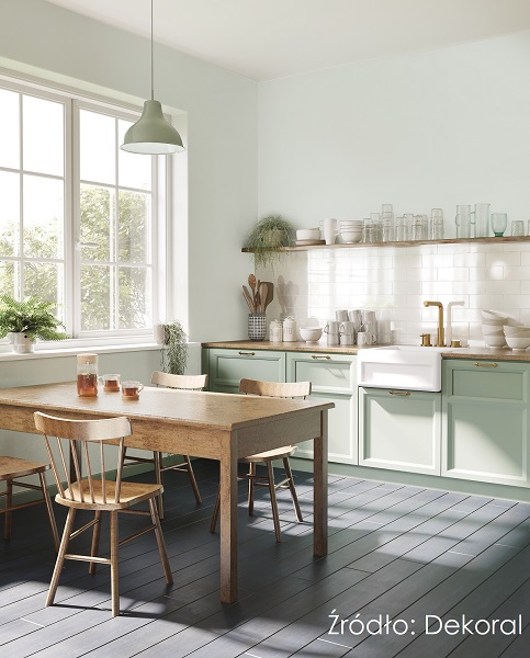 Kuchnia w stylu farmhouse chic może jednak bazować na szerszej gamie kolorystycznej. Nie mniej efektownie zaprezentuje się w wydaniu z cegiełkową glazurą i szafkami w kolorze pastelowej zieleni. Wdzięcznie skomponuje się ona ze ścianami w eleganckim Szarym popielatym farby Dekoral Effect 3in1, przeznaczonej także do intensywne użytkowanych pomieszczeń. Drewniane blaty, meble i kuchenne utensylia oraz tradycyjna ceramika każdorazowo będą stanowić must have kuchni w takim stylu.