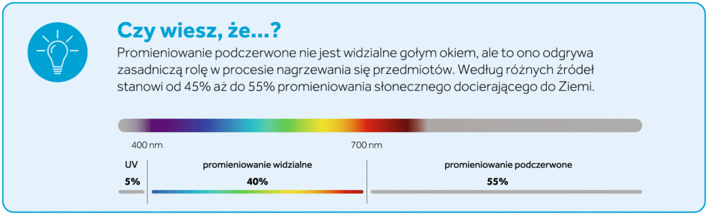 Nagrzewanie się budynków, w tym pokryć dachowych, związane jest w dużej mierze z promieniowaniem podczerwonym. Choć jest ono niewidoczne gołym okiem, stanowi od 45% do nawet 55% całkowitego promieniowania słonecznego docierającego do powierzchni Ziemi. To ono odpowiada za intensywne nagrzewanie się dachów, elewacji oraz innych powierzchni wystawionych na działanie słońca. Pokrycia dachowe zawsze, choć w różnym stopniu, pochłaniają promieniowanie podczerwone, co skutkuje wzrostem temperatury zarówno pokrycia dachowego, jak i wszystkich warstw dachu. Może mieć to nawet wpływ na wzrost temperatury pomieszczeń wewnątrz budynku.
