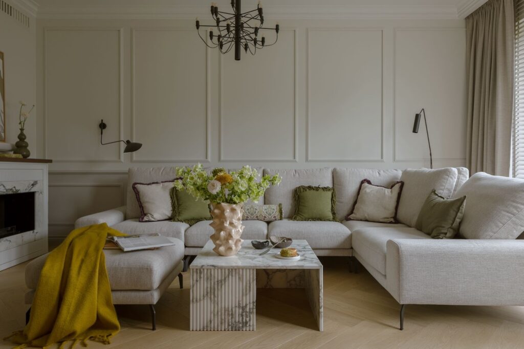 Florystyka to nie tylko zawód, ale sposób postrzegania świata – przez fakturę, zapach, gest. Dlatego projektantka chciała, by mieszkanie było jak ogród zimowy: pełne światła, ale nie krzykliwe, harmonijne w proporcjach i kolorach. Dominują beże, ciepłe szarości i naturalne tony, które stapiają się w spójną, miękką całość.