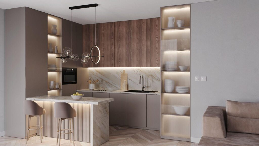Starannie dobrane materiały i konsekwentna kolorystyka sprawiają, że kuchnia płynnie przechodzi w salon, tworząc funkcjonalną całość. Niewielka wyspa subtelnie oddziela strefy, będąc jednocześnie jadalnią i dodatkowym blatem roboczym. Marmurowy rysunek na ścianie oraz blacie wprowadza dynamikę, a bezuchwytowe fronty tworzą spójną kompozycję, urozmaiconą przez wzór drewna na wyższych segmentach zabudowy i podświetlone witryny z falowanym szkłem efektownie eksponujące ceramikę. Chromowana armatura CUMULUS z wyciąganą, 2-funkcyjną wylewką i aeratorem kontrastuje z ciemnym, granitowym zlewozmywakiem MEZZO II z dekoracyjnymi, połyskującymi drobinkami. Podobne zestawienie kolorystyczne dopełniające dopracowaną aranżację widać na piekarniku i geometrycznej lampie.